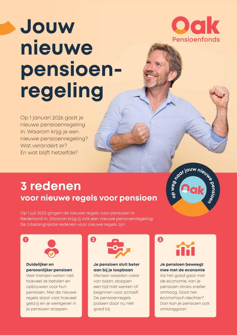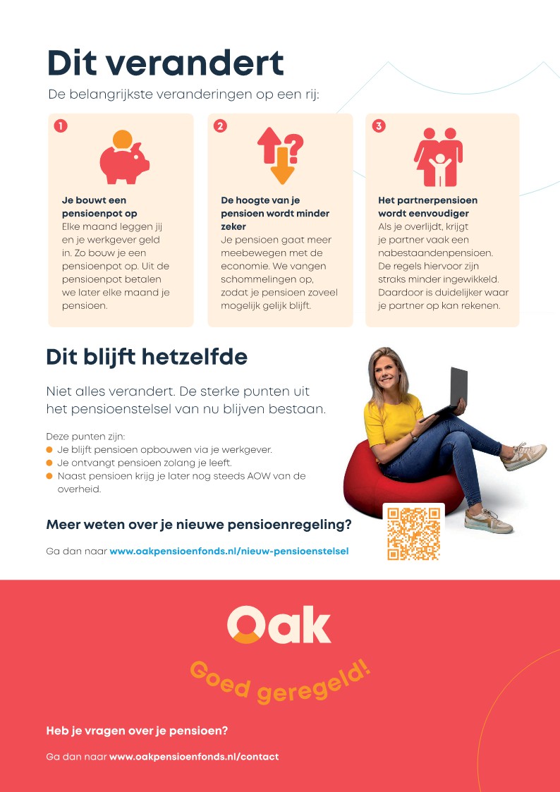 De flyer op deze pagina kun je gebruiken bij communicatie richting je werknemers over de nieuwe regels voor pensioen. Je kunt de flyer als .jpg downloaden door met de rechtermuisknop op de flyer te klikken en te kiezen voor 'Opslaan als'. Als je de flyer als .pdf bestand wil downloaden, gebruik dan de link onder de flyer.