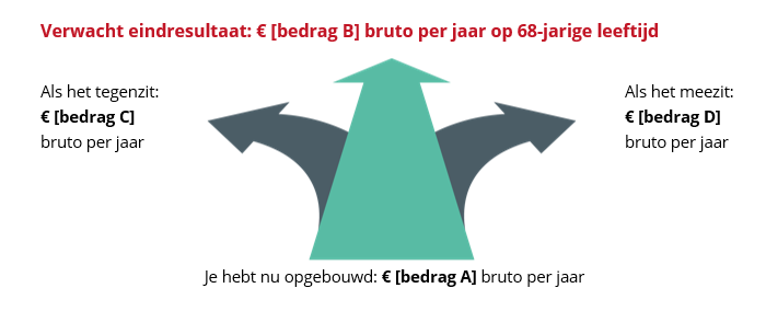 Het bedrag bij de bovenste pijl in het midden (bedrag B) is het verwachte eindresultaat. In de praktijk zal je pensioen ergens tussen de bedragen aan de linker- en rechterkant uitkomen. Wat je pensioen uiteindelijk wordt, hangt af van hoe de economie zich ontwikkelt. Gaat het heel slecht met de economie en stijgen de prijzen juist fors? Dan kan je pensioen uitkomen op het linker bedrag (bedrag C). En als het juist beter gaat met de economie, dan kan je pensioen uitkomen op het rechter bedrag (bedrag D). Er is een hele kleine kans dat je pensioen nog iets lager of hoger uitkomt dan de bedragen die u hier ziet.